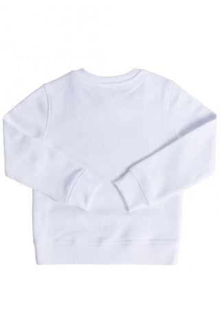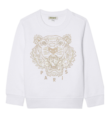 Cool kids will love the new Kenzo Kids’ collection. Expect lively prints and signature vibrant-hued dresses, T-shirts and sweats. This white cotton and gold-tone metallic fibre Tiger sweatshirt features a round neck and long sleeves