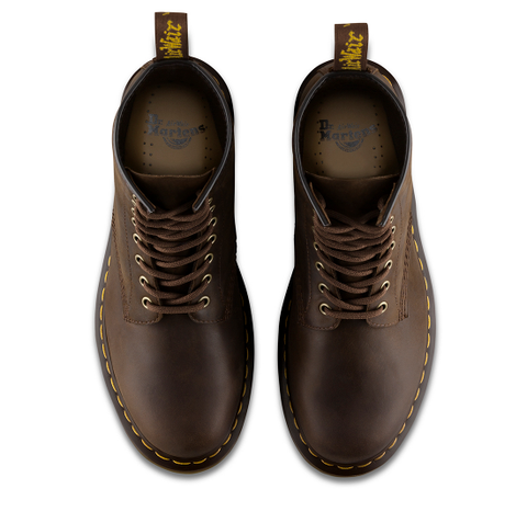 A new leather for an old classic: this iconic 8-eye 1460 boot is made with Crazy Horse, a solid leather with a worn, distressed look.